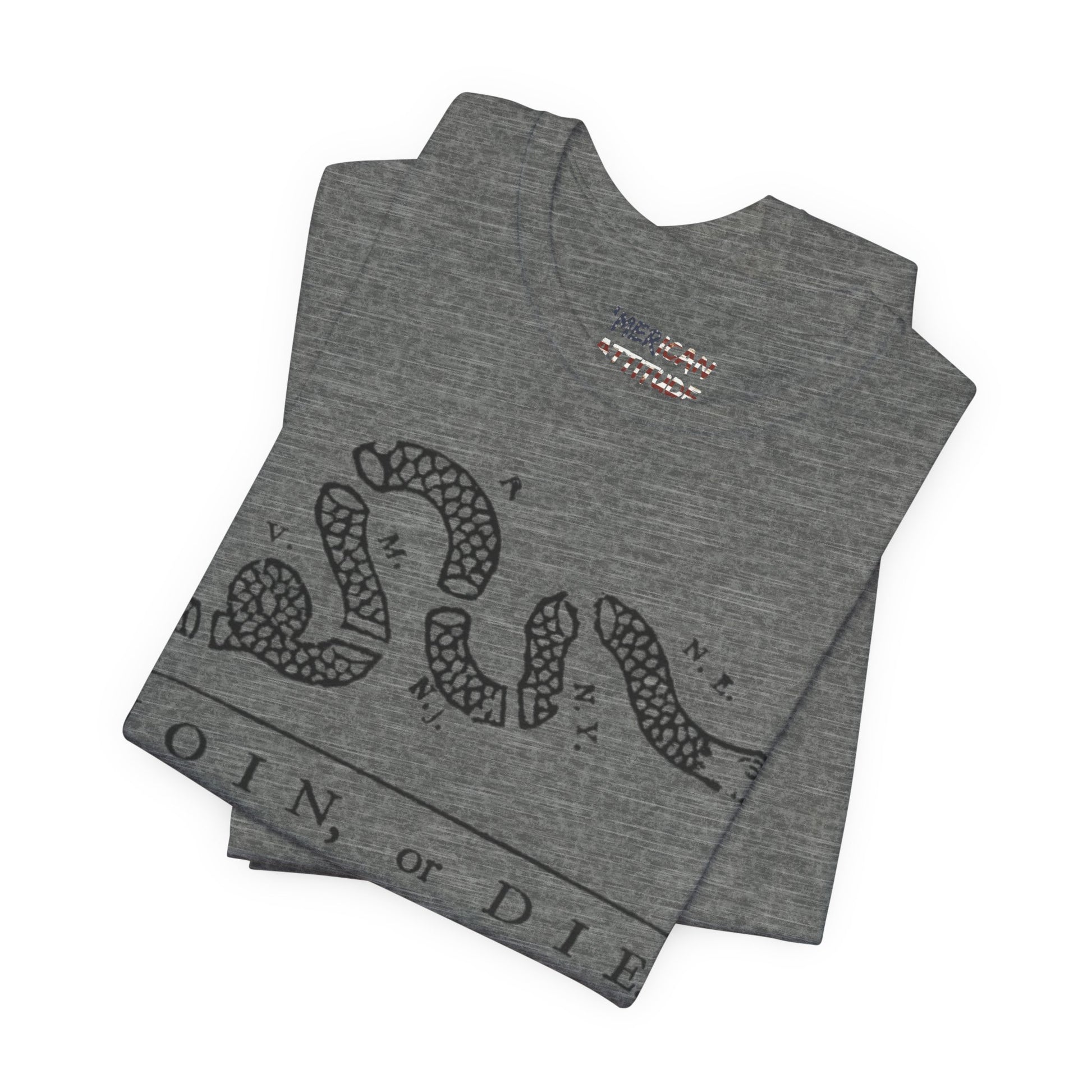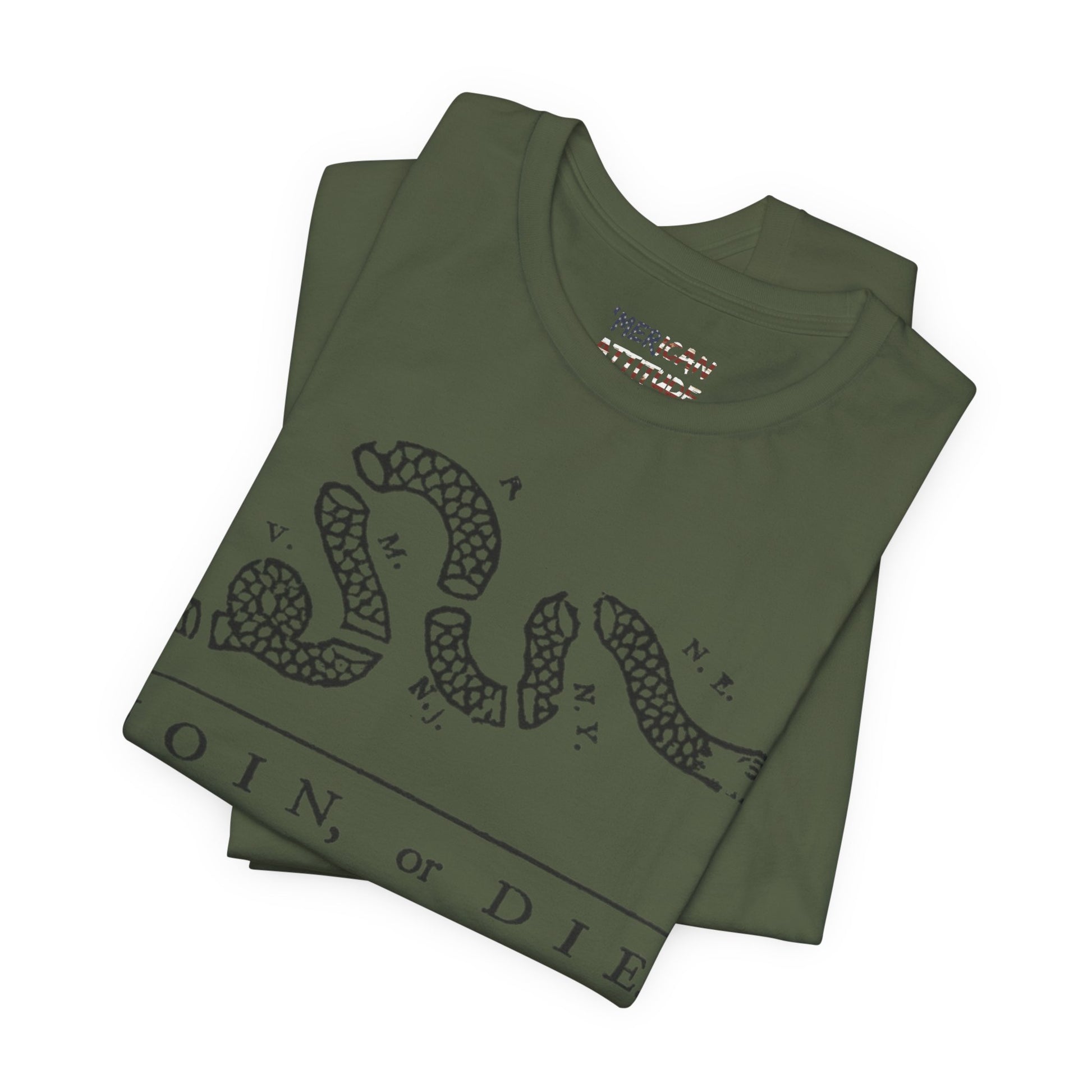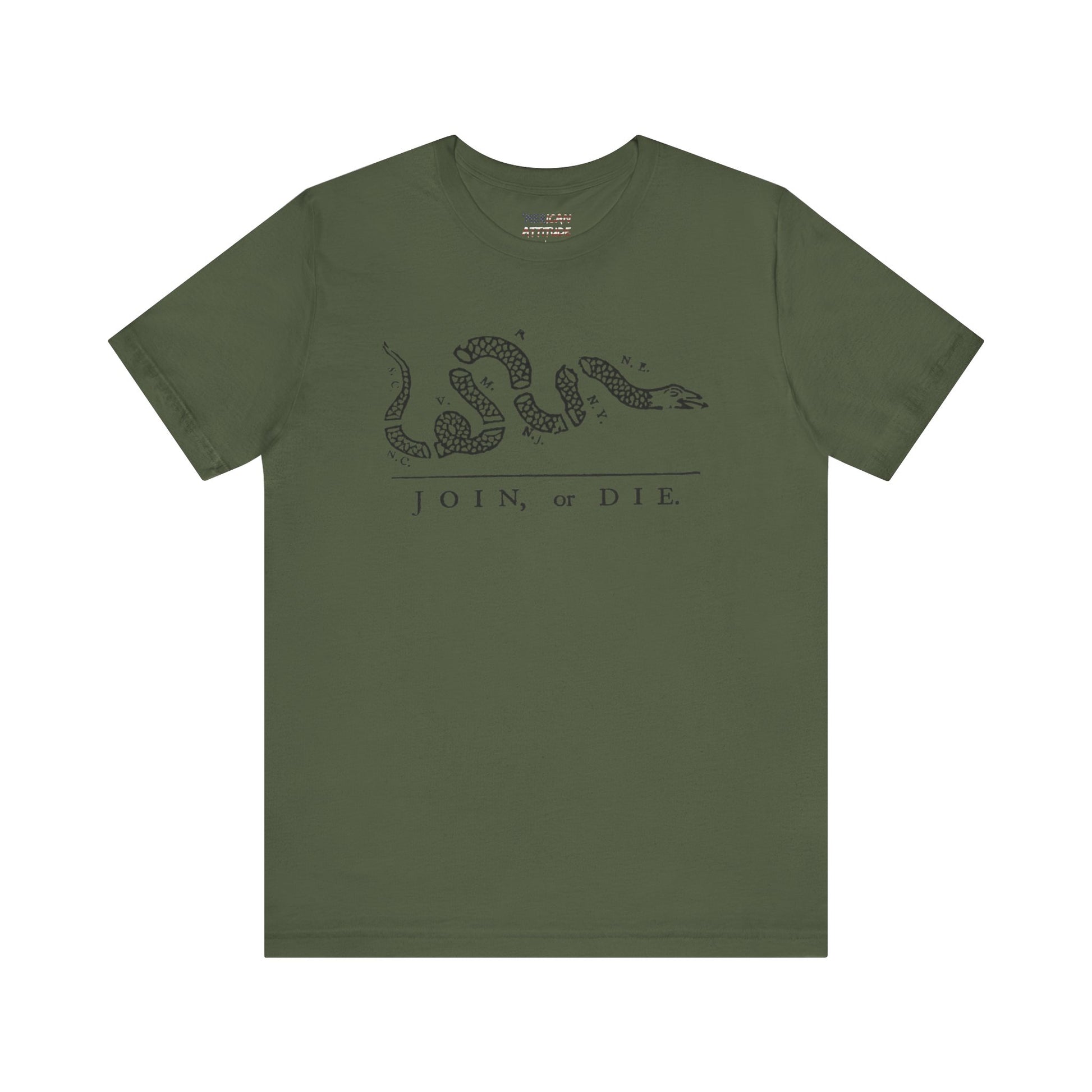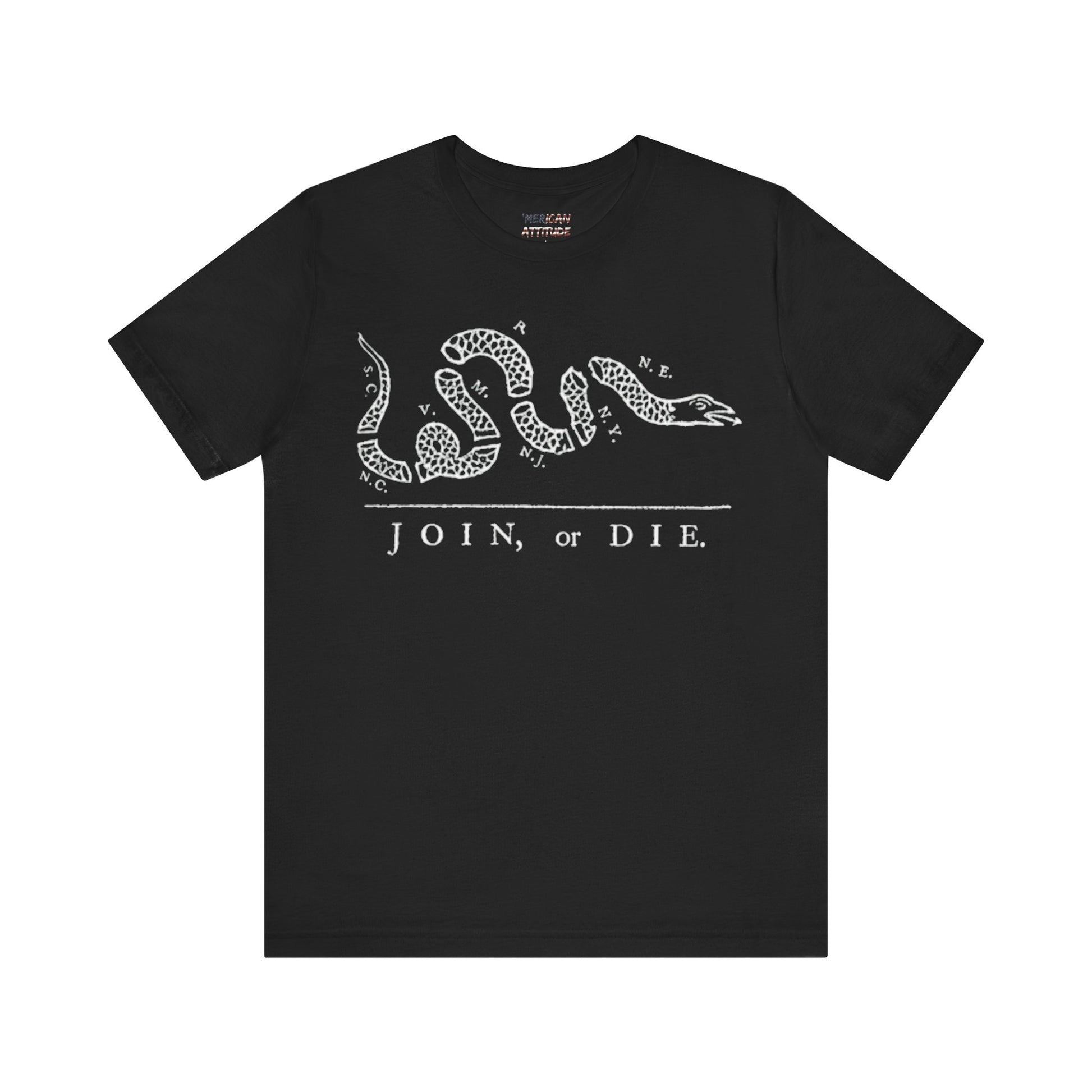 This shirt honors the political cartoon showing the disunity in the American colonies, originally in the context of the French and Indian War in 1754. Attributed to Benjamin Franklin, the original publication by The Pennsylvania Gazette on May 9, 1754, is the earliest known pictorial representation of colonial union produced by an American colonist in Colonial America. It was based on a superstition that if a snake was cut in pieces and the pieces were put together before sunset, the snake would return to life.