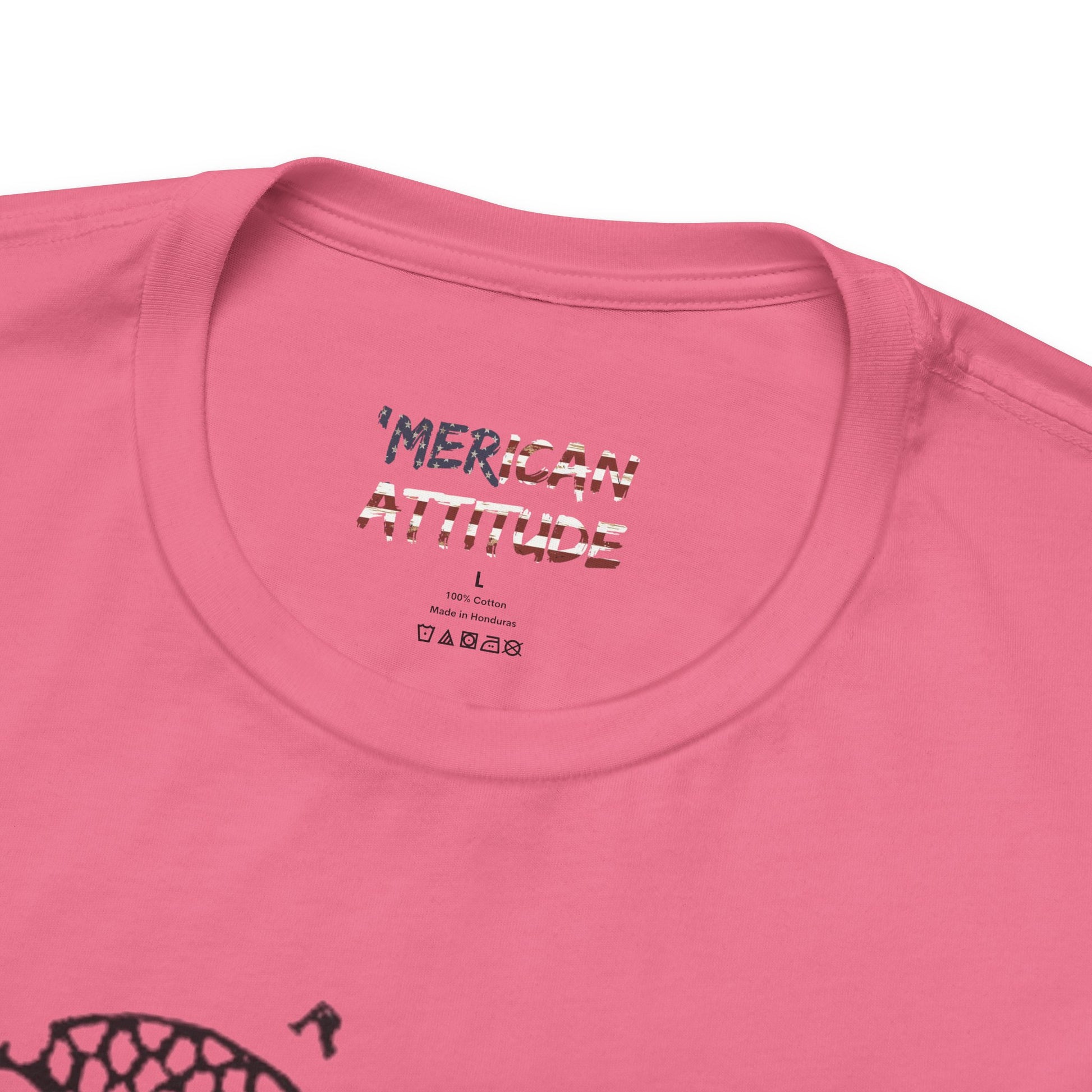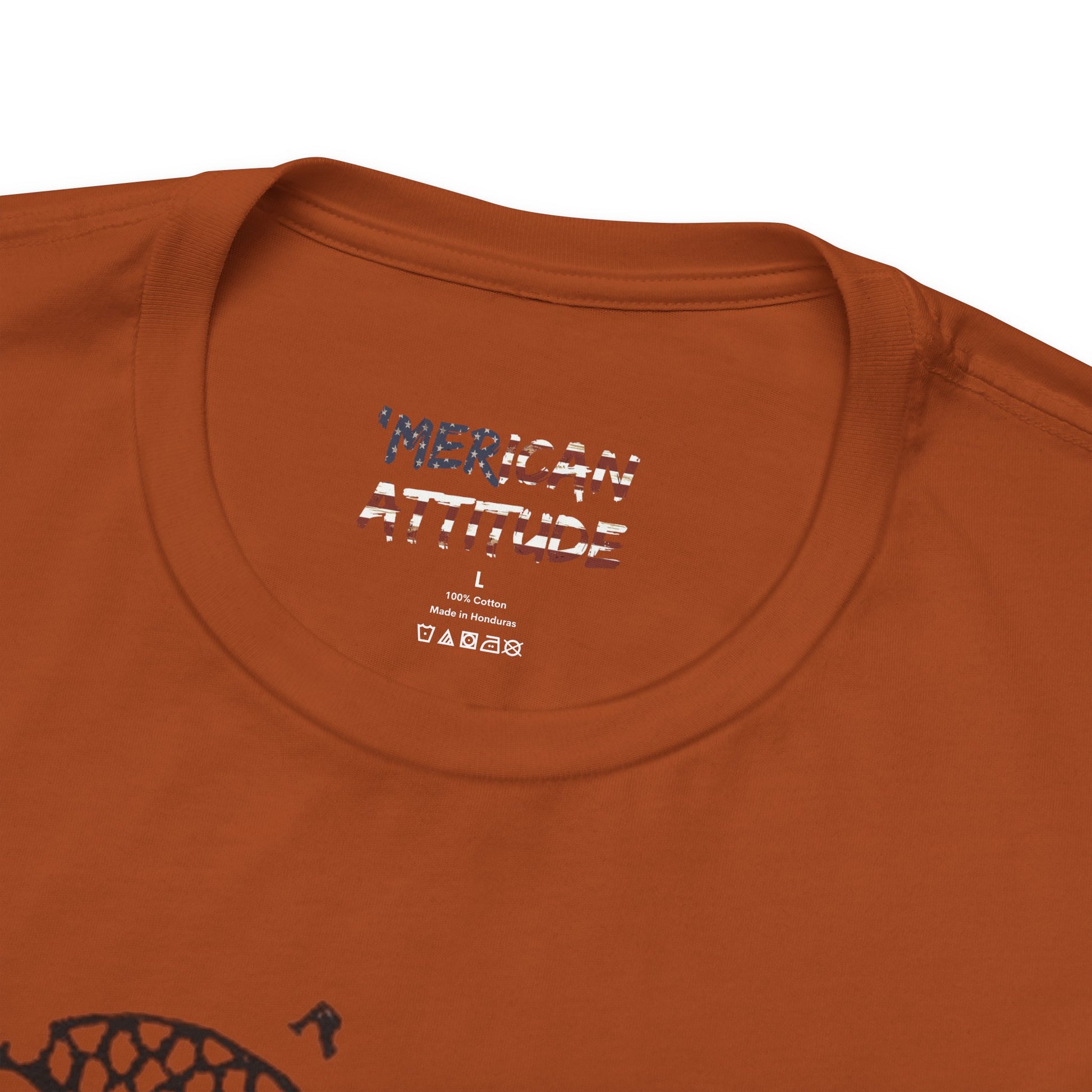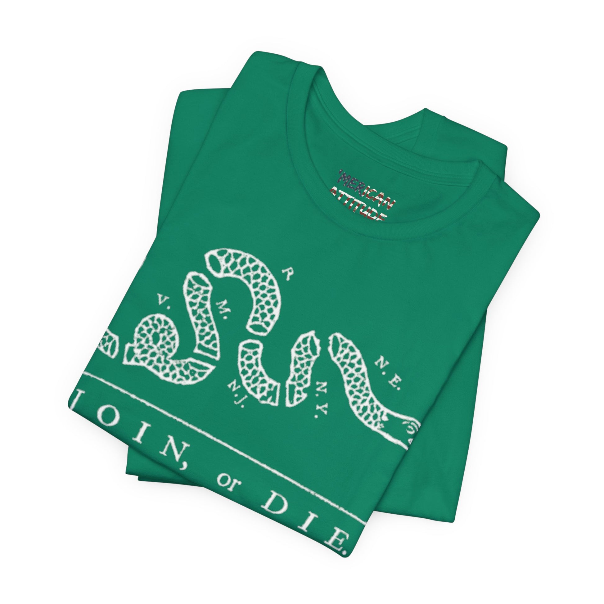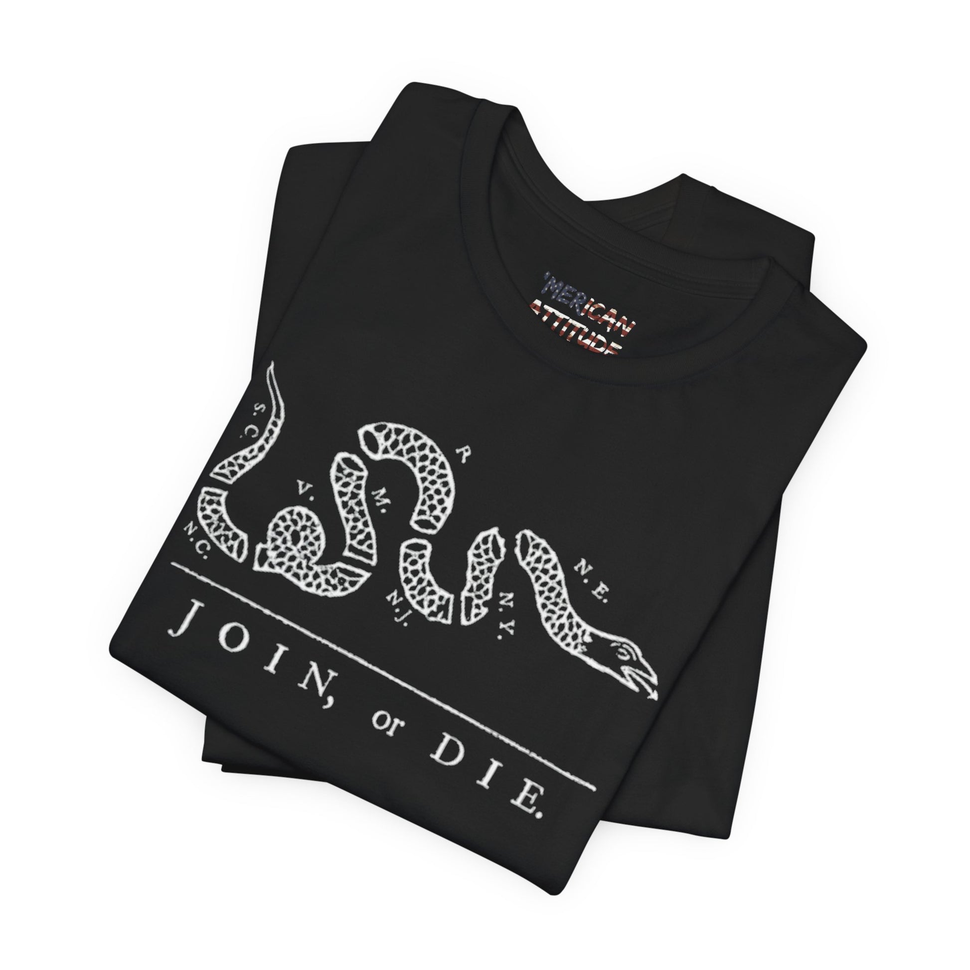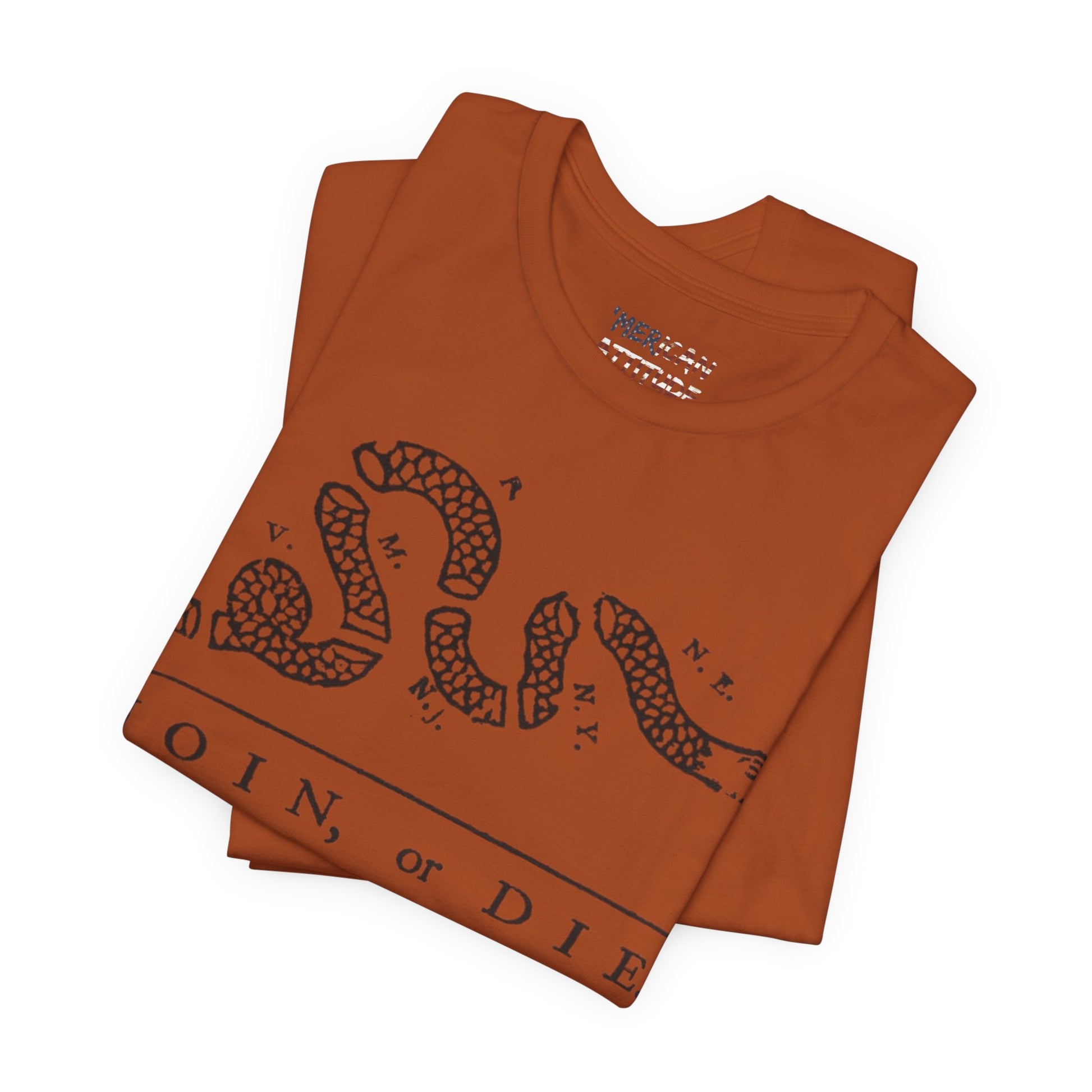 This shirt honors the political cartoon showing the disunity in the American colonies, originally in the context of the French and Indian War in 1754. Attributed to Benjamin Franklin, the original publication by The Pennsylvania Gazette on May 9, 1754, is the earliest known pictorial representation of colonial union produced by an American colonist in Colonial America. It was based on a superstition that if a snake was cut in pieces and the pieces were put together before sunset, the snake would return to life.